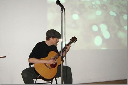 Erik Davis performs on solo acoustic guitar in front of an audience for the first time ever. Photographer unknown