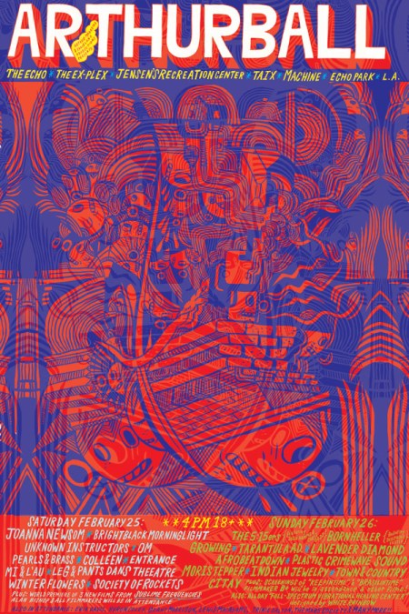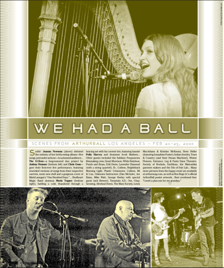 ArthurBall — a two-day, 1,000ish-capacity, multi-venue music & culture festival in Echo Park on Feb. 25-26, 2006, curated by Arthur Magazine and produced by Spaceland Productions — was the second of three Arthur festivals in a period of 14 months. Our ludicrous idealism was nearing its peak. I reminisce a bit about it in the latest (paywall-less) Landline. —Jay