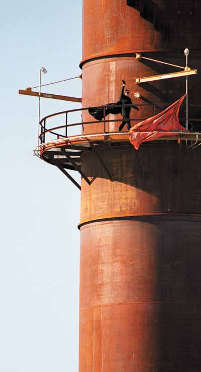 (ABOVE: Celeste Draisner, 27, of Mountain Gate, Calif., walks around a catwalk on Knauf’s 199-foot smokestack in Shasta Lake, Calif., on Wednesday. She was protesting the new fiberglass manufacturer