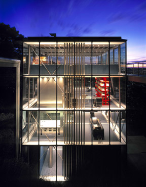 “Already regarded as an architectural icon comparable to Mies van der Rohe’s Barcelona Pavilion or Farnsworth House, Werner Sobek’s glass house R128 (R??merstrasse 128) in Stuttgart is residential technology taken to the highest possible level of sophistication. Sobek’s open-plan cube wrapped in a glass shield is an ecological show-house of precise minimalism. There are no walls and no closed rooms. The house provides its own energy. Recognizing Sobek’s voice, the front door opens if called. R 128 is a prototype. R 129 is already being planned.”