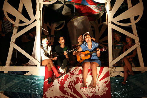 In the winter of 2007 a nice bar called Ducky’s Lagoon in Illinois took Miss Rockaway in and dry docked our giant raft. We love them for that. Recently, we plopped Miss Rockaway back in the water with a crane and we’re getting back on the river soon with a bigger and better show, more rafts & boats, more workshops and a good helping of face painting or the kids.