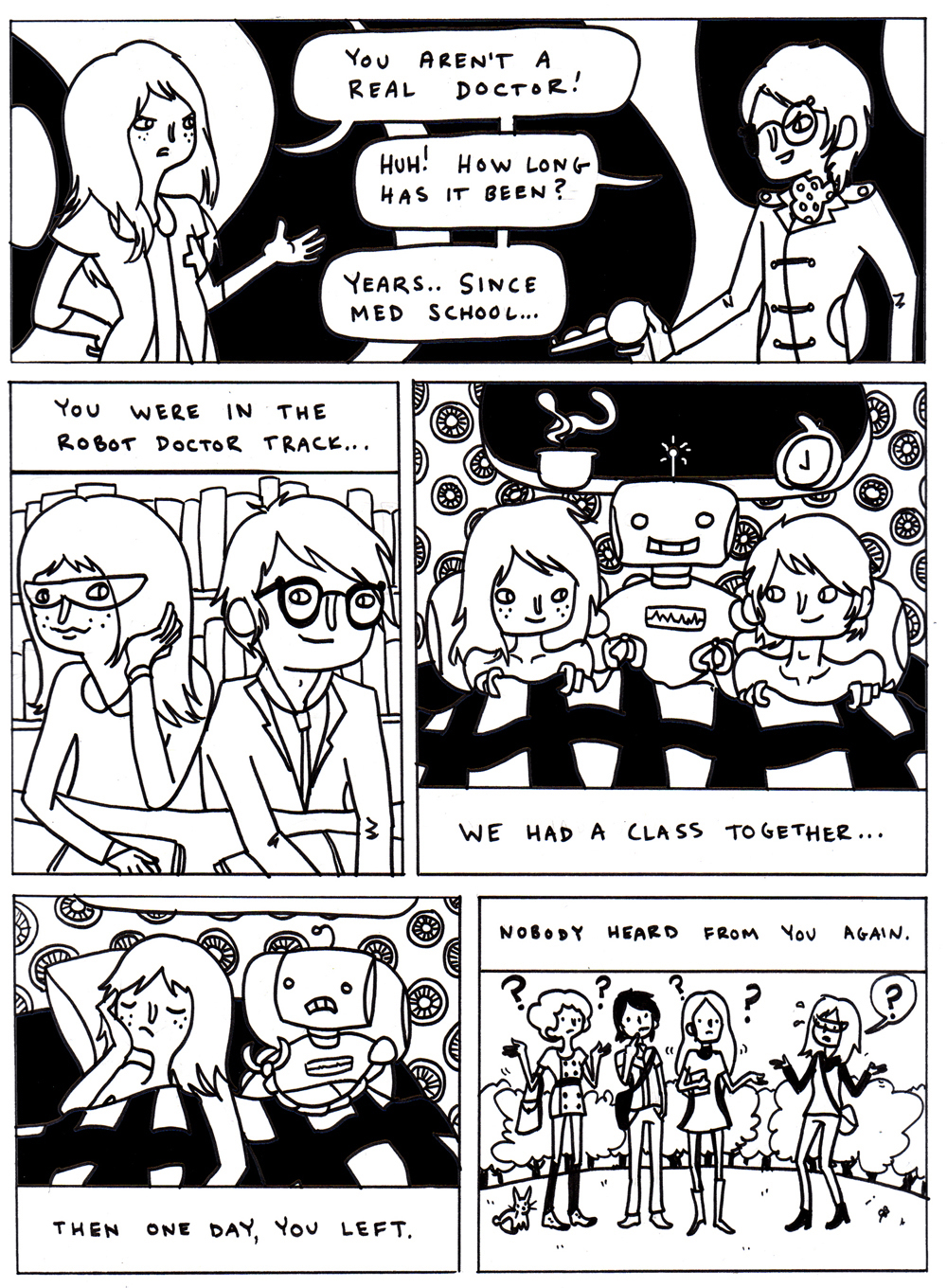 Katie Skelly lives in New York City. She works full time and is working on an art history M.A. so she does comics whenever she has spare time. Sparkplug distributes the Nurse Nurse series, and she hopes to have the fifth issue out very soon. Her website is calicocomics.com. Arthur is pleased to present issue 4 of Nurse Nurse, which we’ll serialize in 3 parts. Here’s pt. 2 and pt. 3!