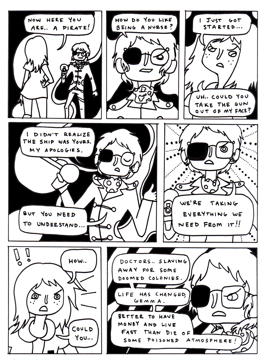 Previously: In issues 1-3, interplanetary nurse Gemma is sent to space to help heal atmosphere-poisoned colonists on Venus. She’s attacked by a butterfly farmer who experiments in aphrodisiacs and steals a top secret book, which gets her demoted to a mission on Mars. On the way to Mars, two space pirates, Bandit and Pandaface, hijack her ship and loot it for parts. Gemma discovers a way to escape the pirates but it lands her on a familiar adversary’s ship.