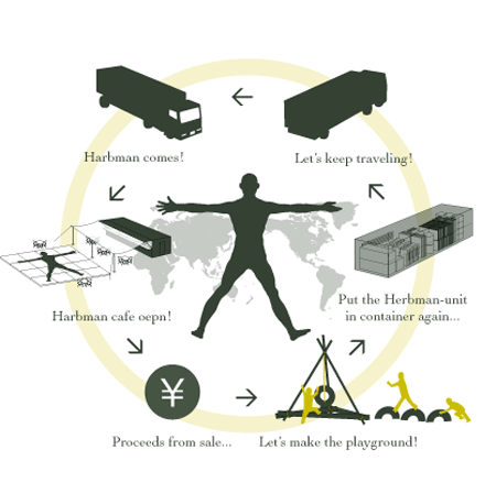 “Herbman carries his trunk (the container) as he travels, bringing good health and giving dreams to children wherever he goes. This is the vision of our project. Herbman is a person-shaped herb garden. Various herbs are planted in this garden. Herbs are planted on Herbman’s body according to their effects: for example, herbs that aid digestion are planted in the stomach area, and herbs that work to relieve shoulder stiffness are planted in the shoulder area. In this way, Herbman acts as a kind of herb dictionary. Just by looking at Herbman, people can learn which herbs work for their trouble spots. We also plant herbs that grow naturally in the locale, so that our herbs are constantly changing, and a site-specific Herbman is born in each locale.”