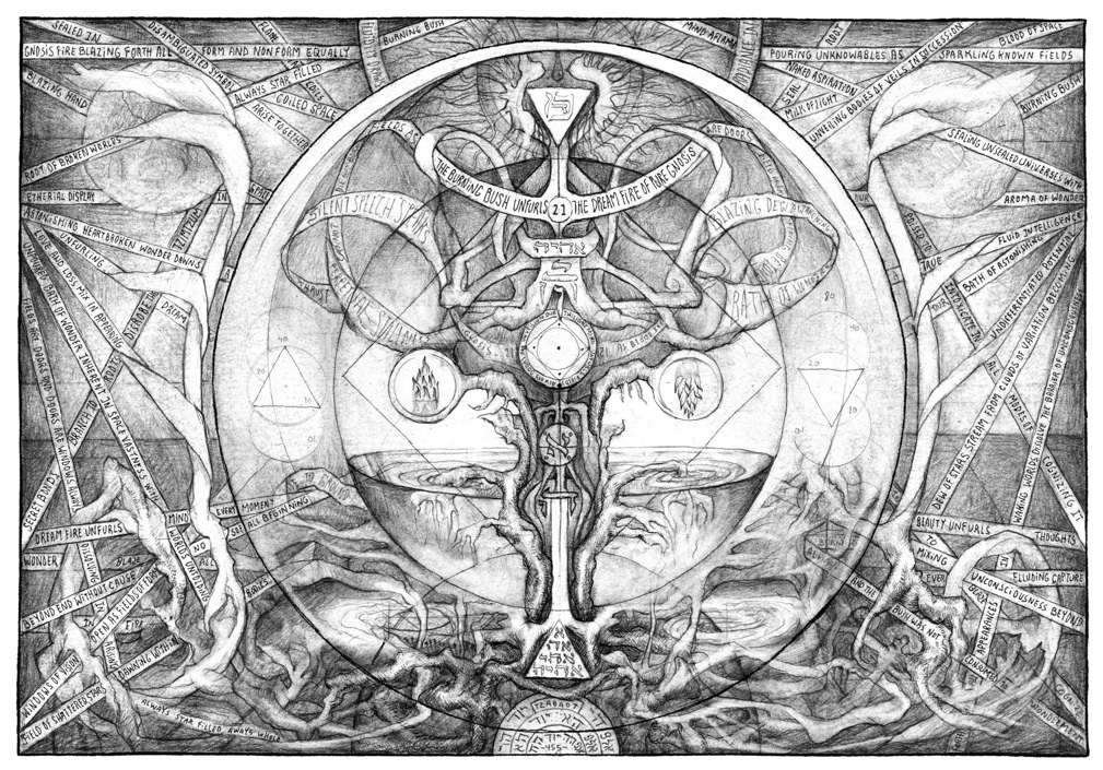 And yet, the author of these stupefying drawings is alive and well—David Chaim Smith [above] is a contemporary New York artist with an MFA, a publisher and (until recently) a gallery. Despite living a semi-monastic life, Smith seems eager to engage with a curious public. He has a website. He’s on Facebook. Dig a little and you’ll find a few occultist-oriented podcast interviews and accounts of public talks he’s given in the last few years around the publication of his two books—2010’s esoteric exegesis The Kabbalistic Mirror of Genesis: Commentary on Genesis 1-3 (Daat Press) and 2012’s massive art/text collection The Sacrificial Universe (Fulgur)—and a 2010 gallery show. And now, here he is on the other end of the telephone line in late January, just days after completing his new book, Blazing Dew of Stars, set for publication this springOctober 23, 2013 by Fulgur. A surprisingly garrulous fellow, Smith spoke frankly about who he is, where he comes from and how his day-to-day life and spiritual practice generates such artwork. What follows is a condensed version of our conversation.