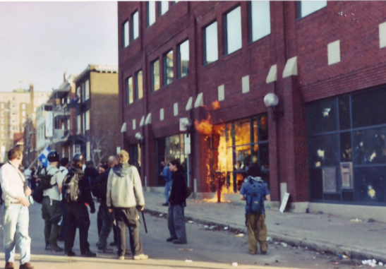 Motivated by my newfound civic responsibility Defend Brooklyn LLC bought a video camera to sacrifice at Quebec City Riots. She was a young camera, so full of promise. I post her dying moments below to remind readers of that time we call “<911,” when people were sensible and kicked the windows out of any city brazen enough to host a convention of corporate colonialists trying to genefuck the world’s seedbanks into sterility.