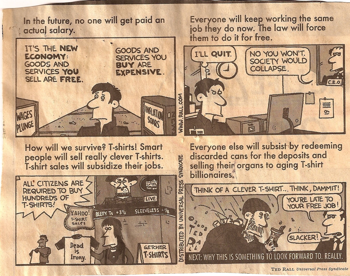 It was nothing less than fear of abject impecunity that forced me to shake off the stage fright, pick the melted Twix bar out of my hair, untangle myself from the lime green bra and drag that box of shirts to the corner and sell those motherfuckers to some insane people.