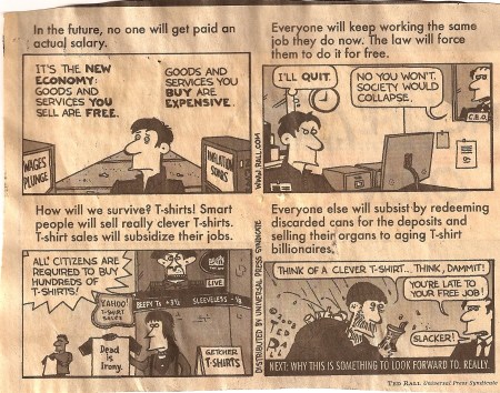 the revolutionary bent of the modern T-shirt fad suggested that, despite years of anger management classes, behavior medication and lack of decent education Americans can still get mad enough to shell out twenty something dollars to be rebellious. Which means a lot, considering votes are free.