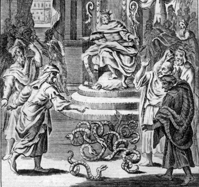 Ancient diplomacy: Moses’ brother performs magic(k) before the pharoah and his court of magicians in this depiction of Exodus 7:12. What was the pharoah doing with all of those magicians anyway?