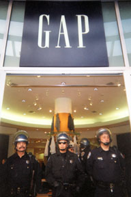 Fortunately, occult forces sometimes have a funny way of revealing themselves. In 2001, members of the Center for Tactical Magic were enjoying a leisurely tromp through downtown San Francisco with a few thousand other people protesting the 21st Century’s first major display of government occultism: George W. Bush’s inauguration. At the end of the trolley line at Powell and Market, the march lost momentum and gradually slowed to a jiggle. Some protesters scurried into cafes to get their latte fixes while others started break-dancing to boom boxes in the streets. Meanwhile, riot police began to huddle in the doorways of the GAP. There were other big department stores and icons of global capitalism nearby, but for reasons unknown the GAP seemed to be getting the bulk of police attention. (Perhaps it was one of those rare instances where Power reveals itself, as if the cops were hinting, “You’re already gathered to fight injustice, you might as well protest conformist fashion produced by sweatshop labor, too.”) At first, no one seemed to care, except possibly the few shoppers who hurried away at the first signs (namely, armored cops) that something might be amiss. Gradually though, activists seemed to take to the idea, and soon a small group settled down at the feet of the police line to sip their lattes and eat their lunches.