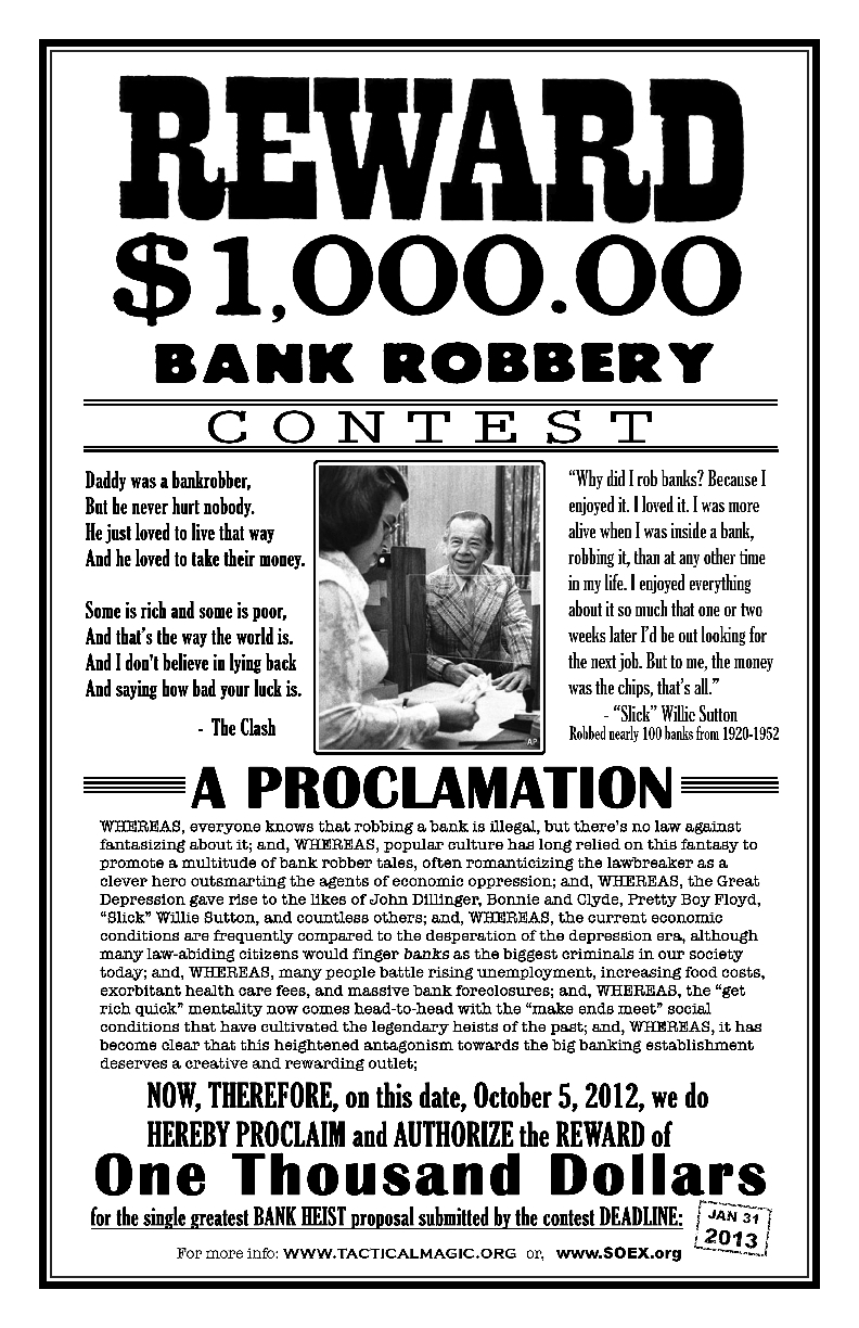 The Bank Heist Contest is a participatory cultural endeavor designed to re-visit the romantic representation of bank robbers in relation to the current economic and social crises, including: income disparity, unemployment, housing foreclosures, federal bailouts, the LIBOR scandal, and a wealth of other egregious economic indicators. It is organized by the The Center for Tactical Magic with support from Southern Exposure, a non-profit arts organization in San Francisco. For inquiries, please email: heistcontest@tacticalmagic.org