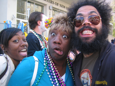 Our tipsy author, right, with fellow revelers at the Rex Parade, Mardi Gras morning.