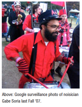 So cut to Purim – only six members of the group can make it, but that’s plenty: group founders MattVaughan Black and Robert Starnes, L.J., Churchy, Fensterstock and me. We’re decked out in our traditional red, black and white garb. The congregants in the synagogue are dressed even more outlandishly and it’s rad. Finally, the service starts. An older gentleman begins to read the Megillah of Esther in Hebrew and we’re all waiting around to hear the magic tragic name of that sneaky murdering bastard Haman to be uttered and when it is – wham! The Noisician Coaltion erupts quickly and messily. Sirens wail, Theremins are distorted and I, the sole member on percussion, bang out the barely recognizable rhythm of “Big Chief.” Smiles erupt throughout the synagogue. This, the assembled folks seem to be thinking, is RAD.