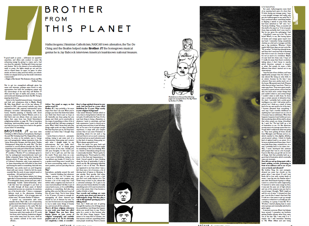 Hallucinogens, Ukrainian Catholicism, Nascar town alienation and the Beatles helped make BROTHER JT the homegrown musical genius he is. Jay Babcock interviews America’s least-known national treasure.