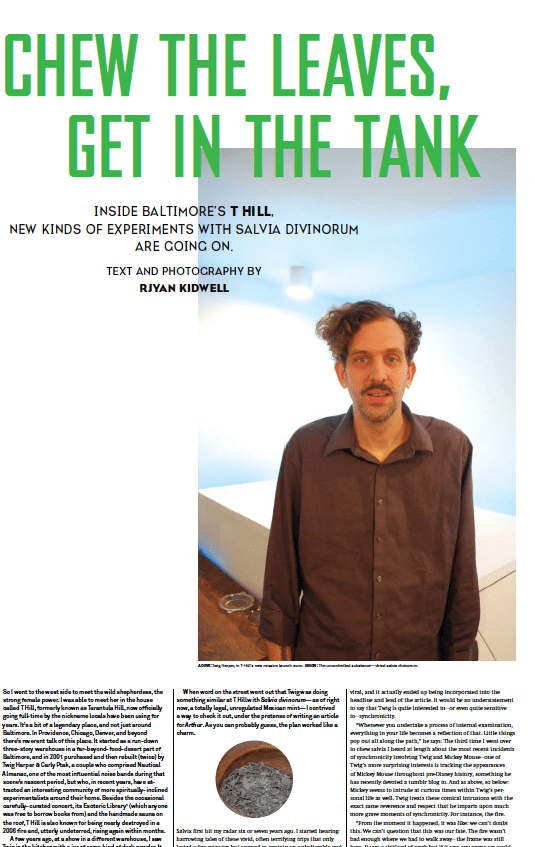When word on the street went out that Twig was doing something similar at T Hill with Salvia divinorum—as of right now, a totally legal, unregulated Mexican mint—I contrived a way to check it out, under the pretense of writing an article for Arthur. As you can probably guess, the plan worked like a charm.