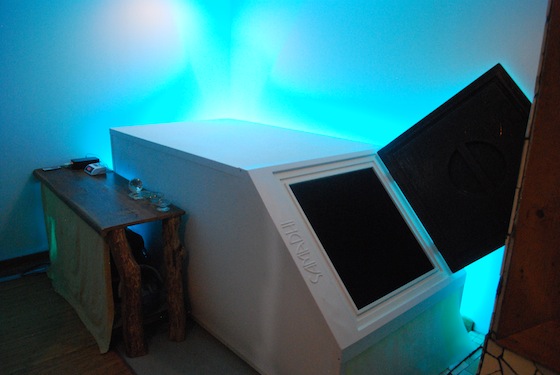 A few years ago, at a show in a different warehouse, I saw Twig [pictured above] in the kitchen with a jar of some kind of dark powder. It turned out to be something called yopo and he was inviting people to try it. Two at a time excited volunteers would sit down beside each other on a couch and inhale the powder. Then, for about five minutes or so, they would be enter some kind of pre-verbal (post-verbal?) state, utterly unresponsive to any attempt by others to communicate with them, interacting with something else none of us could see, but without leaving their seat. Moreover, these reactions seemed unique to each volunteer. I saw two of my friends sit down together—one of them, who I often refer to behind his back as Lord Byron, writhed and contorted as if he were riding an rusty rollercoaster after downing a liter of worms. The other guy barely moved at all, but giggled and smirked adorably, watching something that seemed to be hovering at eye level a few feet in front of him. I’d never seen either of them behave in a way anything like those naked exaggerations of their core personalities. I was impressed. Twig observed everything that happened in an amused but careful way and listened as everybody explained their perspective of the experience afterwards. His genuine curiosity about each person’s trip was clear. Personally, I was way too scared of what strange secret I might myself betray in that strange five minutes, so I didn’t step up to the couch. I’ve always regretted that decision.