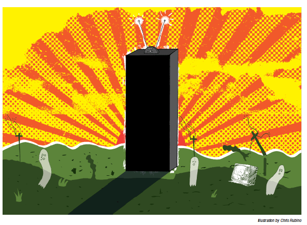 Cathode ray tubes are strange devices: evacuated glass teardrops outfitted with what amounts to a ray gun, blasting electrons at an array of glowing phosphors that, in color TVs anyway, look like psychedelic Op-Art. Sending phantasms invisibly through the air to dance across the surface of these crystal balls has always been a somewhat necromantic act. But if we are going to talk of analog ghosts, we need to talk of analog corpses: the millions of old school TVs that are now being sacrificed to the landfill lords of forced obsolescence. Plenty of people will get their hands on converters, of course, but plenty more will just toss out their CRTs and dive, like me, ever deeper into the digital wave. The guy who runs Electronic Recyclers, one of the largest e-waste recyclers in America, thinks that roughly 80 million analog sets will get tossed out over the next year or two. According to a back-of-the-envelope calculation, that’s just under a million and a half tons of TV—a mass that surpasses the weight of the Twin Towers. And that’s not to mention the amount of lead oxide in the glass. Let’s just say I hope outfits like Electronic Recycler are ready to get their hands dirty.