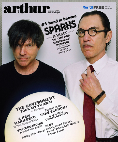 Contents: Chris Ziegler and Kevin Ferguson visit veteran sui generis pop duo SPARKS in L.A. as they prepare to perform their entire 20-album, 240-song ouevre in a single three-wek London engagement in May. “We’re actually better than we thought,” reveal the brothers Mael. Plus: an appropriately outsized ‘Listener’s guide to Sparks’ by Ned Raggett. With photography by Jeaneen Lund // Artist Arik Roper on the art and inspiration of animator RALPH BAKSHI // ENDARKENMENT MANIFESTO: Peter Lamborn Wilson (aka Hakim Bey)’s half-serious proposal for a “coherent spiritual movement that constitutes the only imaginable alternative to unending degradation of Earth and humanity” // Joe O’Brien has a drink with RUDY WURLITZER, the legendary author (Nog, Quake, Flats), screenwriter (Two Lane Blacktop, Walker) and aimless wanderer // The debut of “Advanced Standing,” a new column by Greg Shewchuk which asks, What if we thought of SKATEBOARDING as a mind-body practice? Illustration by Joseph Remnant // New columnist NANCE KLEHM explains how to make dandelion wine and what to do with human pee. Illustration by Aiyana Udessen // Columnist DAVE REEVES on why we can’t let the President kill himself, with an illustration by Sharon Rudahl // TWO PAGES OF FULL-COLOR COMICS, edited by Buenaventura Press, featuring new comics by Anna Sommer, Matt Furie, Kevin Huizenga, Jeffrey Brown, Anders Nilsen, Al Columbia, Tim Hensley, C.F., Ted May, Souther Salazar, Tom Gauld, Jonathan Bennett, Helge Reumann, Lisa Hanawalt, Dan Zettwoch, P.W.E. and Simon Evans // “The Day Is Long”: SPRING FASHION on a Los Angeles afternoon, with photography and styling by Molly Frances and Mark Frohman // Why you’ve always wanted to TALK TO PLANTS, and some of the best ways to do it, according to the Center for Tactical Magic // “Bull Tongue” columnists BYRON COLEY & THURSTON MOORE review choice finds from the deep underground // Magik Markers’ ELISA AMBROGIO waxes enthusiastic about cultural items // The fake economy’s parasitical relationship with the real economy isn’t going to last much longer, says columnist DOUGLAS RUSHKOFF. Illustration by M. Wartella //The government is obsoleting analog television in February, 2009—ERIK DAVIS examines what we are losing. Illustration by Chris Rubino // Noisician/author Gabe Soria reports from New Orleans, singer-songwriter-bandleader Stephen Malkmus updates us on OLIGARCHY ‘08 // Plastic Crimewave memorializes the late great KLAUS DINGER