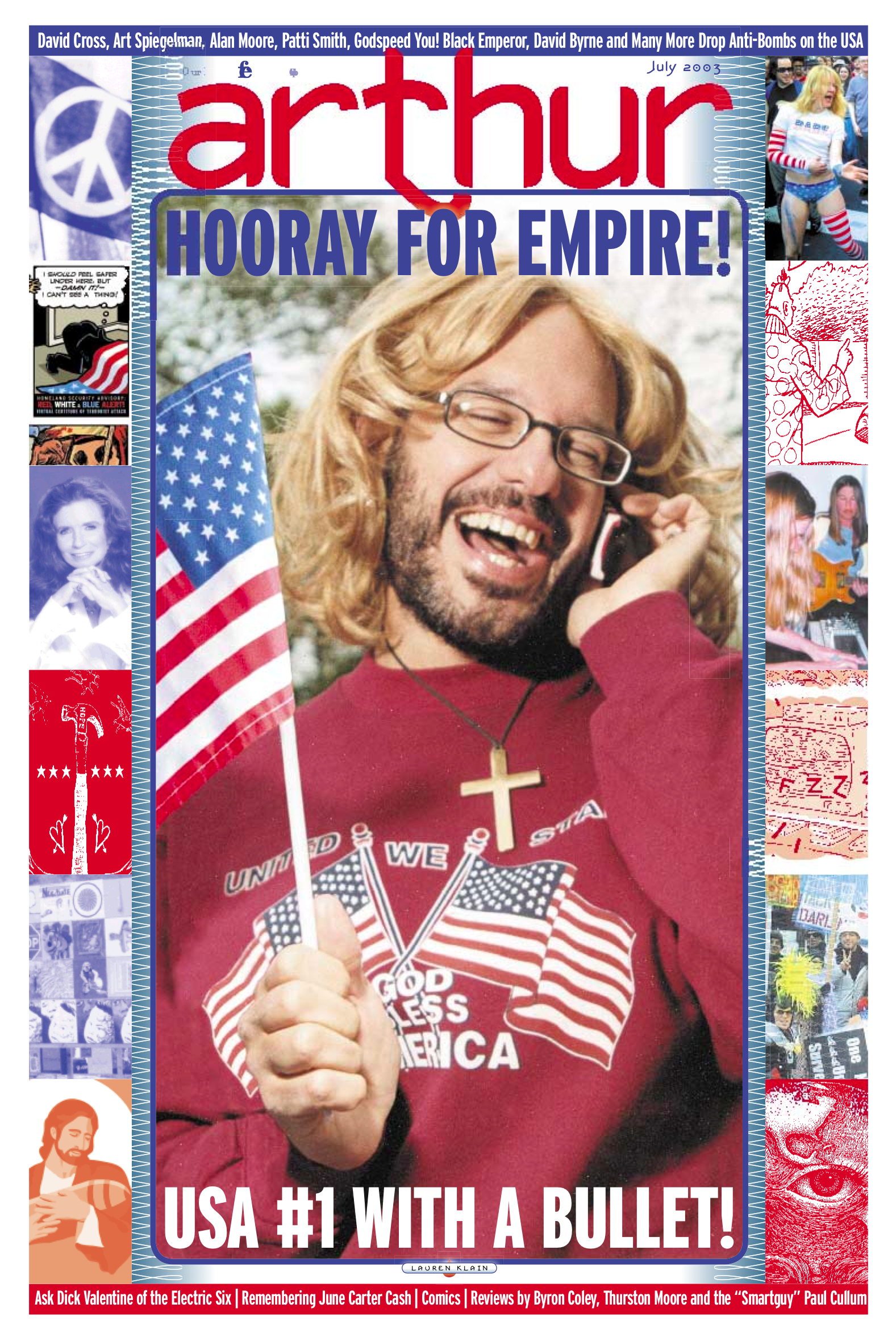 Contents: ARTHUR AGAINST EMPIRE! Photographer Lauren Klain captures DAVID CROSS on his way to a Clear Channel war rally… Jonathan Shainin speaks with CHRIS HEDGES about the truths not being told about war…ALAN MOORE comments on what the US and UK governments have been up to lately….The fabulous GLAMericans are spotlit by Steffie Nelson… DAVID BYRNE writes about his life during wartime… Kristine McKenna on the Tower of Protest, a Vietnam-era action on Sunset Blvd by celebrated artists. With photos by Charles Brittin… Righteous poetry by MICHAEL BROWNSTEIN, CHARLES POTTS and AMY TRUSSELL… Art and comics by Steve Andersen, Tauno Blisted & Mac McGill, Robbie Conal, John Coulthart, Godspeed You! Black Emperor, Bill Griffith, Megan Kelso with Ron Rege, Peter Kuper, David Lasky, Sharon Rudahl, Patti Smith & Jem Cohen, art spiegelman, and Carol Swain… MICHAEL MOORCOCK on the fate of empires… DANIEL PINCHBECK on why he’s glad George Bush is president; and new Arthur film columnist Paul Cullum asks “Is George Bush addicted to cocaine?” // Advice column by DICK VALENTINE of the Electric Six // “Keeping Two: Part Four” by Jordan Crane // Jeff Brown, Martin Cendreda and Johnny Ryan gift us with comics throughout the mag // Byron Coley & Thurston Moore do their review column bit // Paige La Grone Babcock remembers June Carter Cash