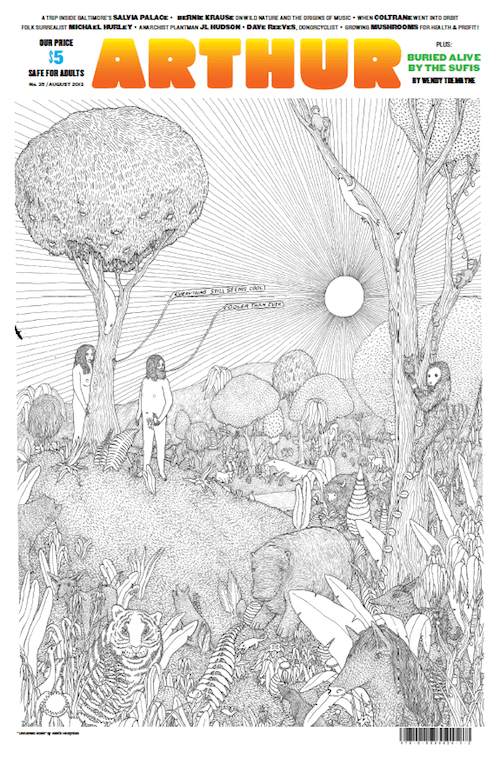 Contents: Cover by Kevin Hooyman // Guitarist, composer and analog synthesizer pioneer BERNIE KRAUSE left the recording studio to find that really wild sound. What he discovered was far more profound. Interview by Jay Babcock. Illustrations by Kevin Hooyman // Wily folkplayer MICHAEL HURLEY has charmed hip audiences for over 50 years with his timeless surrealist tunes and sweetly weird comics, all the while maintaining a certain ornery, outsider mystique. Longtime Snockhead/Arthur Senior Writer Byron Coley investigates this Wild American treasure in an enormous feature replete with rare photos, artwork, comics… and a giant color portrait by Liz Devine // Inside Baltimore’s T HILL, new kinds of experiments with salvia divinorum and flotation tanks are going on. Journalist/photographer Rjyan Kidwell visits Twig Harper, Carly Ptak…and the Wild Shepherdess // BURIED ALIVE BY THE SUFIS: Swap-O-Rama Rama founder and author WENDY TREMAYNE wanted to understand what motivated her life-long anti-consumerism. She found the answer underground. Illustration by Kira Mardikes // DAVE REEVES on the price motorcyclists pay for being better than you. Illustration by Lale Westvind // Stewart Voegtlin on JOHN COLTRANE’s startling 1960s ascension from space bebop to universe symphonies. Dual astral/material plane illustration by Beaver // FLOWERS, LEAVES, ANARCHISM: Matthew Erickson on the J.L. Hudson Ethnobotanical Catalog of Seeds // Camilla Padgitt-Coles visits Enumclaw‘s Norm Fetter at his family’s Pennsylvania mushroom farm // The Center for Tactical Magic on demons and drones // New full-page full-color comics: “Forgiveness” by Julia Gfrörer and Part 2 of Will Sweeney’s “Inspector Homunculus” serial // The “Bull Tongue” exhaustive survey of underground cultural output by your intrepid guides Byron Coley and Thurston Moore