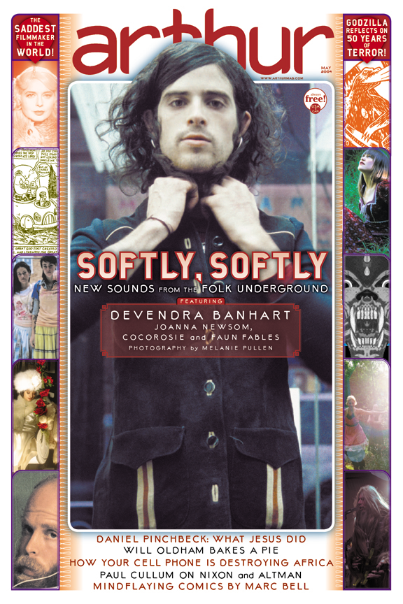 Contents: DEVENDRA BANHART is here and he plays folk music. Trinie Dalton finds out where he’s coming from. Photos by Melanie Pullen. // Harp-playing folksinger JOANNA NEWSOM talks history, theory and inspiration with Jay Babcock. Visions of Joanna by Melanie Pullen. // The two sisters who are COCOROSIE have made an astonishing, haunting debut album. Trinie Dalton finds out how they did it. Photos by Melanie Pullen. // Oliver Hall raps with radical traditionalists FAUN FABLES. Photos by Melanie Pullen. // Director GUY MADDIN is highly resentful, terribly romantic and prone to melancholy. He also makes wondrous, utterly unique films. Kristine McKenna asks him some leading questions. // A slightly testy GODZILLA reflects on his long career in an exclusive interview with Dave Tompkins. Illustration by Brian Ralph. // Merrick explains how cel phones, Playstations and PCs are connected to ecological, human and animal destruction in Africa. Illustration by Ben Jones. // Comics by Marc Bell (a two-page spread!), Ben Katchor, Amy Lockhart and John Porcellino // New doodleisms by Eddie Ruscha, Jr. // Words of advice from T-MODEL FORD // Correspondence from our readers // Commentary by SHARON RUDAHL // WILL OLDHAM on pie and God, as told to Gabe Soria // Arthur columnist DANIEL PINCHBECK talks about the real passion of Christ // James Parker on the autobiography of LEMMY. Illustration by Dustin Amery Hostetler // “Camera Obscura” columnist PAUL CULLUM on Richard Nixon and Robert Altman // The “Bull Tongue” review column by BYRON COLEY & THURSTON MOORE // C & D bicker and enthuse about new records // A new horoscope by IAN SVENONIUS