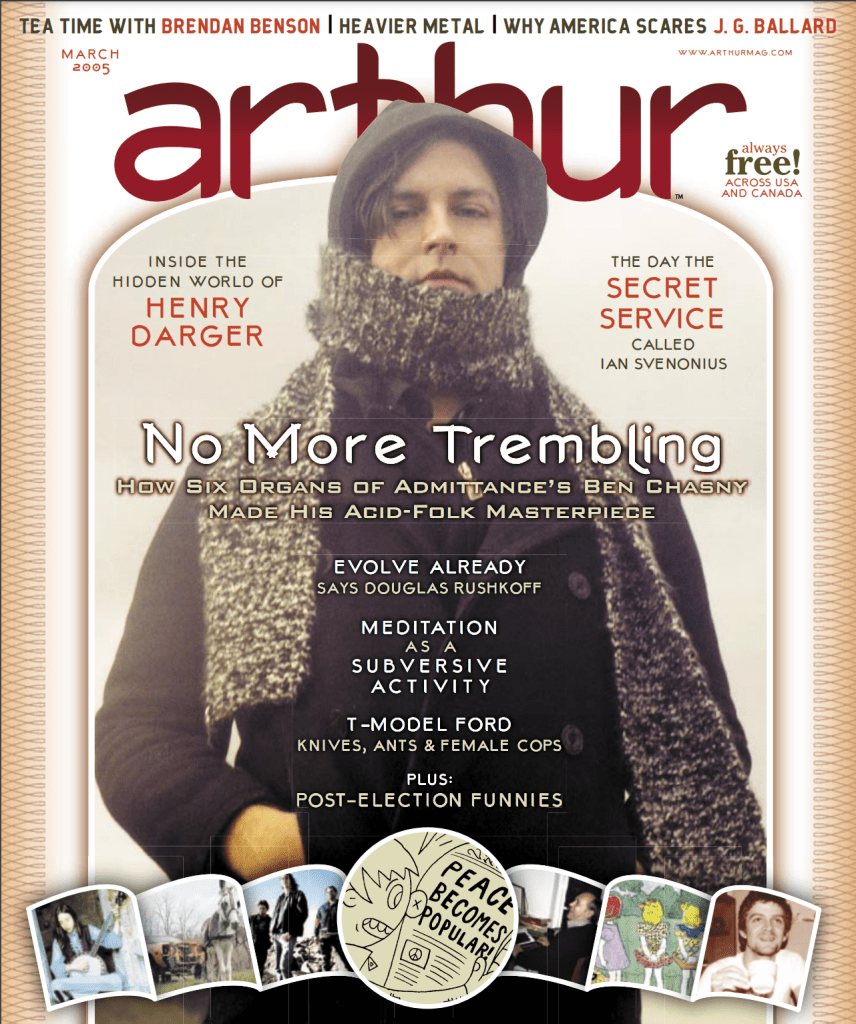 Contents: A close encounter with the enigmatic psychedelic folk adventurer BEN CHASNY of Six Organs of Admittance and Comets On Fire // Controversial novelist and visionary J.G. BALLARD wonders if something fundamental has gone awry in America. Interview by RE/Search’s V. Vale, with an introduction by author Michael Moorcock // MEDITATION as a subversive activity, by Michael Brownstein. Illustrated by John Coulthart // Filmmaker Jessica Yu talks with Trinie Dalton about exploring the life and work of the mysterious artist HENRY DARGER in her new documentary // Columnists Byron Coley and Thurston Moore reflect on ’80 Goddamn Good Things of 2004′ // James Parker on heavier metal by High on Fire, Dead Meadow, Jesu and Om // Comics by Ben Katchor, artwork by John Lurie and “Peace Comics” by Becky Stark & Ron Rege Jr // BRENDAN BENSON explains how a proper cup of tea is brewed // A special feature edited by Tom Devlin on making art in troubled times, featuring new comics by Chris Wright, Brian Ralph, Dan Zettwoch, Megan Kelso, Ben Jones, Paul Lyons, David Lasky, Tom Hart, Vanessa Davis, Greg Cook, Marc Bell, Amy Lockhart and John Hankiewicz // New Arthur columnist DOUGLAS RUSHKOFF on re-inventing the collective for the 21st century. Illustration by Jack Pollock // Weird War vocalist IAN SVENONIUS has a conversation with the Secret Service // Answerman T-MODEL FORD // A horoscope by BECKY STARK // Review crew C & D continue bickering