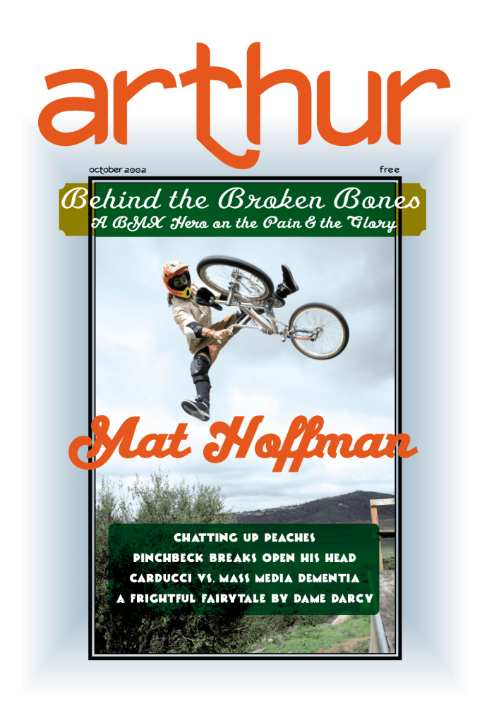 Contents: An exclusive chapter-length excerpt from The Ride of My Life, BMX madman MAT HOFFMAN‘s new autobiography written with Mark Lewman. Photos by Spike Jonze, Steve Giberson and Mike Castillo // PEACHES interviewed by indie-rock godstar IAN SVENONIUS. Portrait photos by Pat Graham and Shawn Mortensen. // An interview with shamanic psychonaut/journalist DANIEL PINCHBECK, author of the just-released Breaking Open the Head. Artwork by Alan Moore. // A rendezvous with ARTHUR C. CLARKE in his Sri Lankan technoasis, by Paul Moody. Illustration by Geoff McFetridge. // A frightful fairtytale in prose by DAME DARCY. Illustrated by the Dame herself. // Writer EDDIE DEAN remembers driving an ICE CREAM TRUCK route in mid-’80s summers through the Blue Ridge Mountains. With stunning photos by Dave Brooks. // An essay by the legendary JOE CARDUCCI (author, Rock and the Pop Narcotic) against the sorry state of contemporary culture. With a painting by Camille Rose Garcia. // One-panel comics by DAVID BERMAN (Silver Jews, poet), including the now-legendary series “Scenes From the First Yes Tour.” // A profile of LIFT TO EXPERIENCE, by Jay Babcock with photos by Jason Amos. // An appreciation of EAGLE PENNELL, the late Texan filmmaking maverick whose work inspired the Sundance Festival. By Paul Cullum. // ASK NEIL HAMBURGER: America’s funnyman offers his considered counsel. // Underground culture, as surveyed at length by the dynamic duo of Byron Coley & Thurston Moore