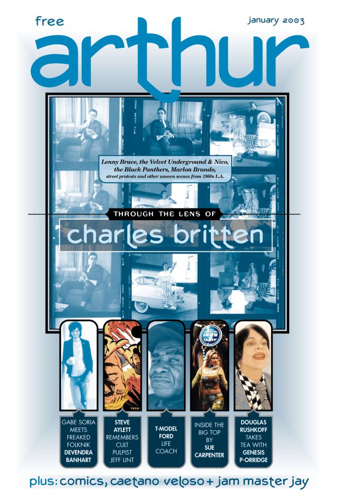 Contents: The West Coast premiere of the Velvet Underground and the Exploding Plastic Inevitable, in 1966? Lenny Bruce and Anita O’Day waiting to score? James Baldwin, Marlon Brando, the Black Panther Party and other good-souled political activists doing what needed to be done? CHARLES BRITTIN was there, and these are his never-before-published photographs, as curated for Arthur’s readers by Kristine McKenna. // He plays guitar and he writes/sings songs like you’ve never heard. He’s also 21 and has got a certain elfish charm. Ladies and germs, DEVENDRA BANHART, as witnessed by scribe Gabe Soria and shutterbug Shawn Mortensen. // Depressed? Hair falling out at age 23? Having sex with your cousin? “I know all about that stuff!” says Arthur’s new advice columnist, 78-year-old bluesperson T-MODEL FORD. // Language as incantation, the art of the cut-up, larval culture, neural re-wiring and what does it feel like to live in a post-authorship world: all in a Sunday afternoon’s teatime with visionary artist-provocateur-human GENESIS P-ORRIDGE and hotshit media theorist DOUGLAS RUSHKOFF. Photos by Shawn Mortensen. // In an exclusive excerpt from his new autobiography, legendary Brazilian musician CAETANO VELOSO takes us to the political, cultural and hallucinogenic frontlines of authoritarian Brazil, 1968. It’s all here: tanks, ayahuasca, street protests, witchcraft cults, and of course, Veloso’s fellow Tropicalistas, the musicians Gilberto Gil, Gal Costa and Os Mutantes. // Self-described desk-bound journalist SUE CARPENTER finds out firsthand and feet-first how women are transforming the 21st-century circus. With photographs by Lauren Klain. // Comics by Kevin Huizenga, Jordan Crane, Anders Nilsen and James Kochalka, and a drawing by Sammy Harkham // Britwit novelist STEVE AYLETT revisits the legend of pulp fictionist/”rogue maniac” Jeff Lint, author of One Less Bastard and creator of The Caterer // Byron Coley & Thurston Moore sort the pepper from the bugpoop in underground recordings, performance, poetry and text // Peter “Piper” Relic remembers JAM MASTER JAY