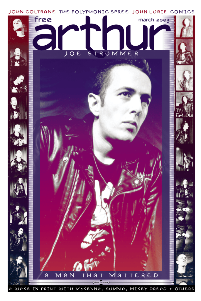 Contents: JOE STRUMMER, 1952-2002 — Arthur holds a wake in print for a man who mattered. In addition to stunning photographs by Ann Summa and excerpts of back-in-the-day Clash coverage from Slash magazine, we present reflections on Joe by Kristine McKenna; a lengthy, poignant interview with Joe from 2001 by McKenna; a consideration by Carter Van Pelt of the Clash’s embrace of reggae, featuring insights from Clash collaborator Mikey Dread; and a brief on Joe’s legacy—a forest in the Isle of Skye. // The intrepid Gabe Soria connects with every single member of THE POLYPHONIC SPREE, the cheeriest 24-person pop symphony on the planet, in addition to chatting at length with Spree leader Tim DeLaughter about the “c” word, the Spree’s next move, and the sadness that remains. Portrait by Paul Pope. // At the height of both his popularity and his artistic powers, JOHN COLTRANE went for something deeper. An exclusive, chapter-length excerpt from A Love Supreme: The Story of John Coltrane’s Signature Album by Ashley Kahn. // ASK JOHN LURIE—he may be in self-described “hermit mode” but this longtime Lounge Lizard is eager to lend a helping hand to his fellow man. And woman too. // In the work of artist SHIRLEY TSE, plastic aspires to more than Pop. Mimi Zeiger reports. // COMICS by Sammy Harkham, Jordan Crane, Johnny Ryan, Sam Henderson, Marc Bell and Ron Rege Jr. // Byron Coley & Thurston Moore review underground music, film and texts.