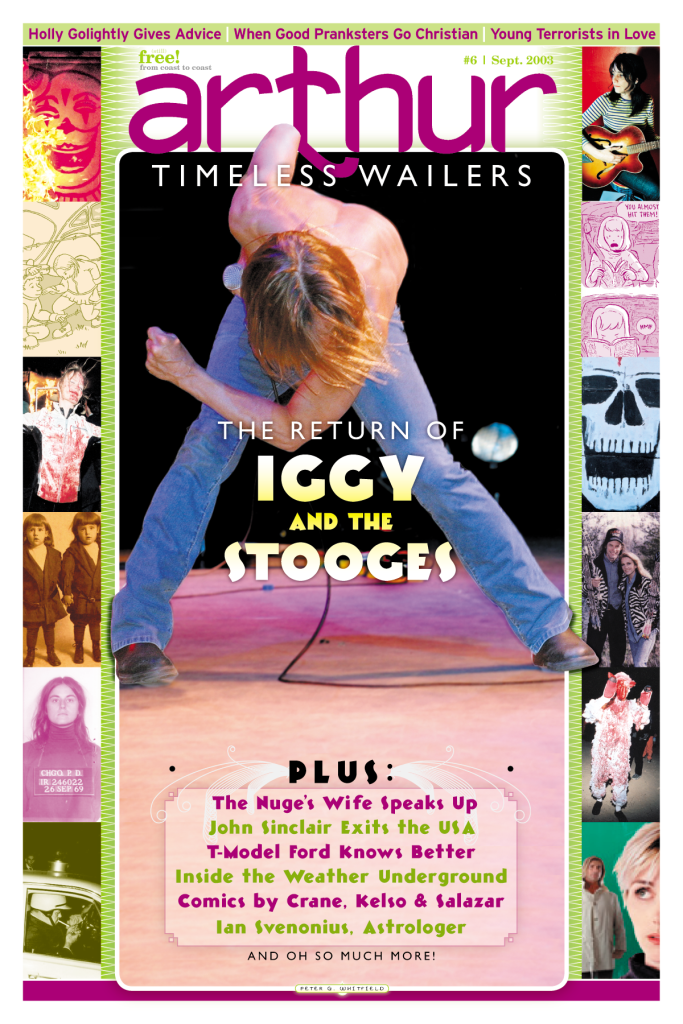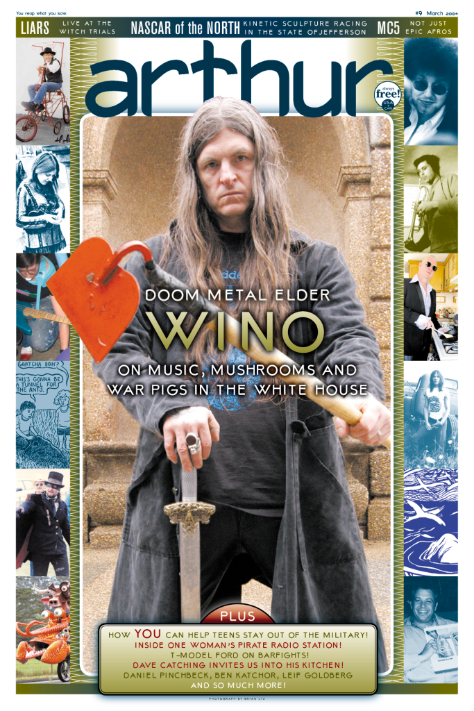 Contents: Legendary doom metal/stoner rock lifer WINO (St. Vitus, The Obsessed, Spirit Caravan,The Hidden Hand, Probot) isn’t finished yet—not with these new war pigs in the White House to dispose of. Text by Joshua Sindell, with photos by Brian Liu // Detroit’s visionary MC5 played like gods, lived like pigs and freed everyone they touched. Steffie Nelson interviews the filmmakers of the astonishing forthcoming MC5 A True Testimonial documentary; James Parker, Ian Svenonius and The Seth Man walk us through the 5’s recordings; and Wayne Kramer, John Sinclair and Ted Nugent talk about the 5’s raw volume. With artwork by Plastic Crimewave, archival photos by Leni Sinclair and vintage posters by Gary Grimshaw // Sue Carpenter ran pirate radio station KBLT out of her Silver Lake apartment for three years. Now she’s written a book about the experience: 40 Watts From Nowhere. Here’s six things she learned. // Hippies with too much time on their hands, or people who have their priorities straight? Journalist/photographer Daniel Chamberlin investigates the Great Arcata-to-Ferndale Kinetic Sculpture Race. // New Arthur columnist Daniel Pinchbeck on the accelerated evolution of human consciousness now underway. // LIARS‘ Angus Andrews talks about misguided angst and paranoia through the ages with Jay Babcock. // How to help keep kids from joining the military: a public service announcement from Arthur and the American Friends Service Committee. // Arthur regular T-Model Ford talks about what to do when someone’s dragging your name through mud. // DAVE CATCHING (guitarist with Desert Sessions, Mondo Generator, earthlings?, Yellow Number Five) invites us into his kitchen and shows us how to make New Orleans Soul Red Beans, Rice and Corn Bread. // Artwork by Seldon Hunt, Leif Goldberg, Ivan Brunetti, John Hankiewicz, Tom Hart, Ben Katchor and Eddie Ruscha, Jr. // Byron Coley and Thurston Moore review tons of stuff in their regular “Bull Tongue” column // C & D bicker about loads of new music, much of it shockingly good. // Horoscope by Weird War vocalist/Gemini Ian Svenonius.