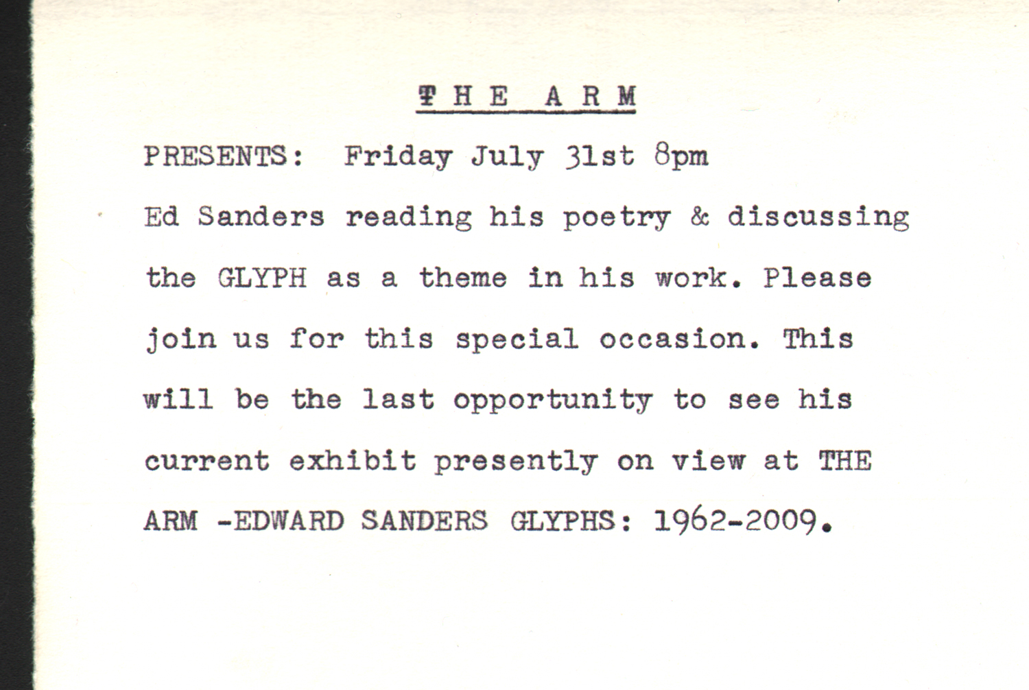 “A rare exhibition of nearly half a century of Ed Sanders’ glyph-poems produced between 1962 and 2009 will be on display at The Arm from July 10 through July 31.