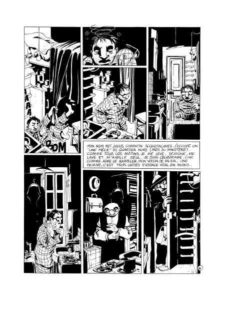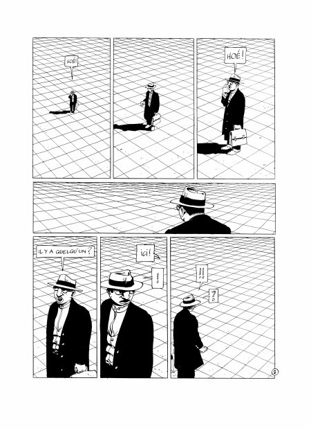 The first surprising thing about L’Origine, and what my friend referred to in his note, was that the book itself had become a character in the story. An impassive hero with a hefty name, Julius Corentin Acquefacques, receives an envelope in the mail. Inside, he finds a page torn out of the very comic we are reading. Through a series of investigations, he comes to realize that he is reading pages from his future, and that he is the hero and savior of his own comic book world. Mathieu had, in a sense, broken through the fourth wall of the comic, allowing the character to become aware of the limits of his world, and of the reader.