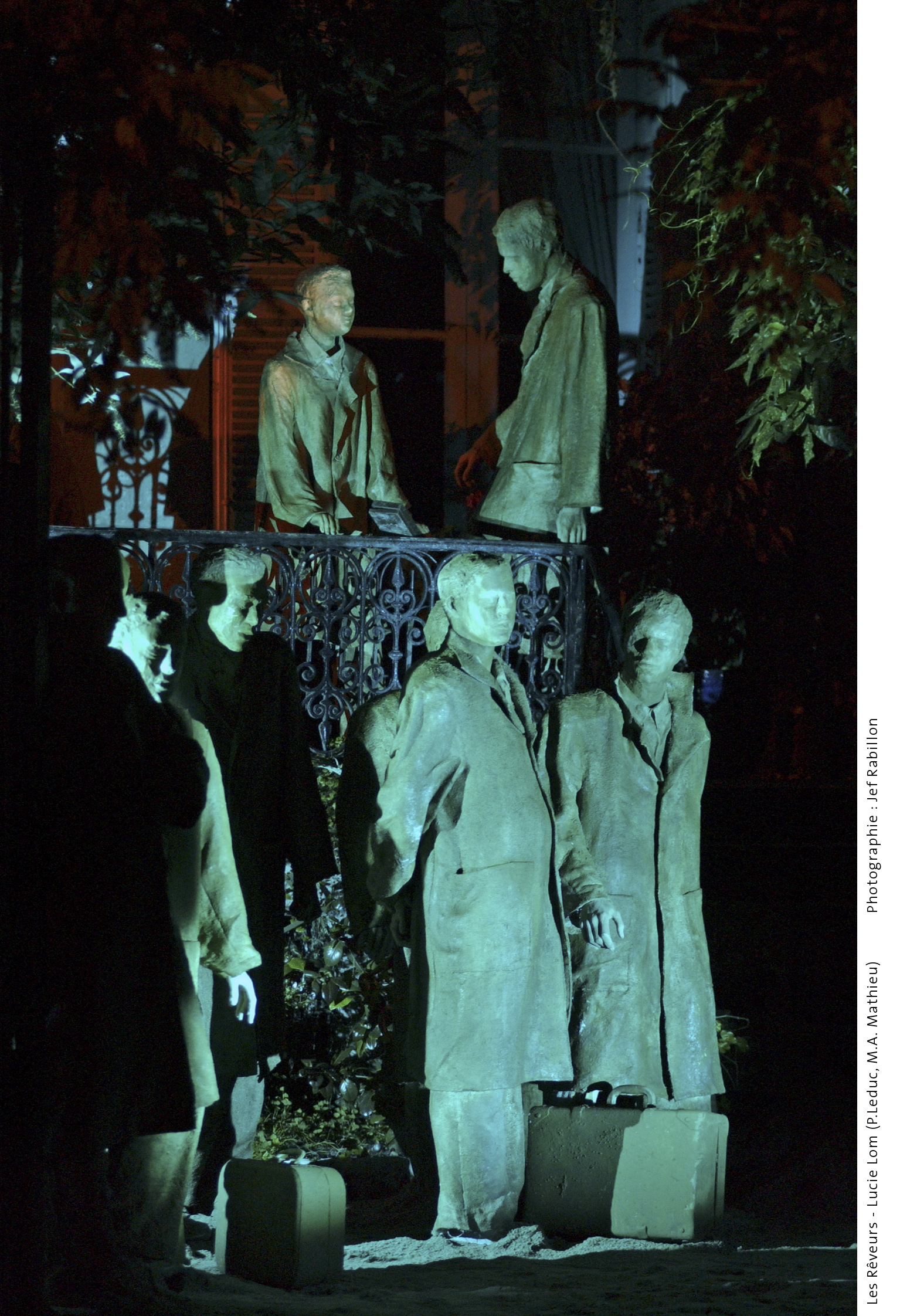 As we left Lucie Lom that day in 2004, we walked through a courtyard past a crowd of white plaster statues that were leaning against the outer walls of the building. These, Mathieu told me, were the Dreamers, plaster men in business attire, buttoned trench coats and wingtips. It was a project that Lucie Lom had done the year before as part of a week-long festival of the arts held annually in Angers. Each evening, the Dreamers appeared in a different spot around the city. One night they stood clustered by a street map, all gazing curiously at the routes they might take. Another night, they were in an alley, looking in puzzlement at the street’s cobblestones, several of which were illuminated. On yet another, they stood in front of a store window, where mannequins lay discarded in various states of undress.