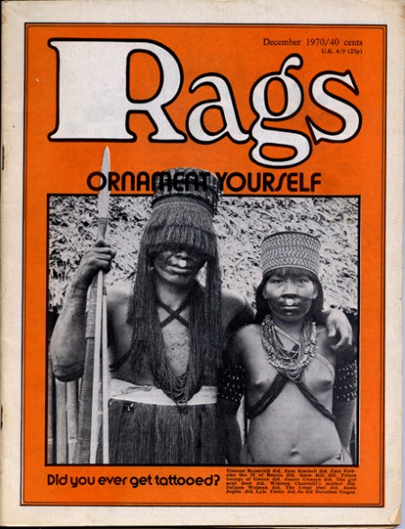A part of the underground press movement, Rags was published for a year, 1970-71. It covered the worlds of counter-culture fashion with street fashion reports, groovy adverts and a very liberated sense of style. As far as I can tell its print run was all b/w on rag paper.