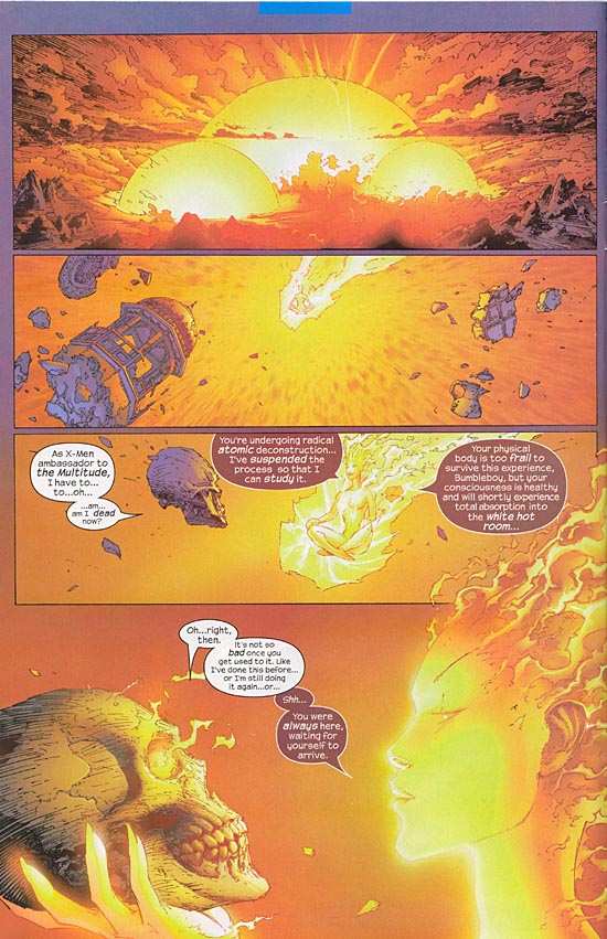 “The core thing everything comes back to, again, is that if you change yourself, you can change reality. And that’s a stupid ‘New Age’ idea, but…[it’s also] ‘as above, so below’-the hermetic philosophy thing. The character that runs a thread right through The Invisibles-who’s the core of it-is Jack Frost. He starts off as a completely rough kid, he’s nothing, and we follow this guy as he develops into a future buddha, and we see how that affects the entirety of everything.