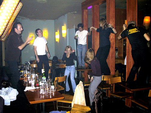 Above: Joe Strummer leads an impromptu dancing-on-the-tables moment at a restaurant in New York City, sometime in the late ’90s. (Photo courtesy Chris from Hellcat/Epitaph.)