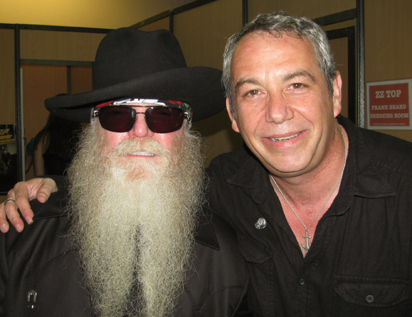 “backstage w/us are the zz top guys – pretty happening for me cuz I saw them in the early-middle 70s and really dug their third and fourth albums big time, really fucking BIG time – I loved them and they were my kind of power trio in those days, my favorite. you know, when I do interviews about bass I’m thinking now I don’t give enough credit to dusty roads cuz I learned tons from him. I’m gonna make that right. I get to talk some w/frank beard, the drummerman – what a very nice guy. so is mr dusty, man, he is something. his fingers are kind of small, like thumbs but man, he can work a bass like no one’s business. he is very kind to me too. what nice cats….