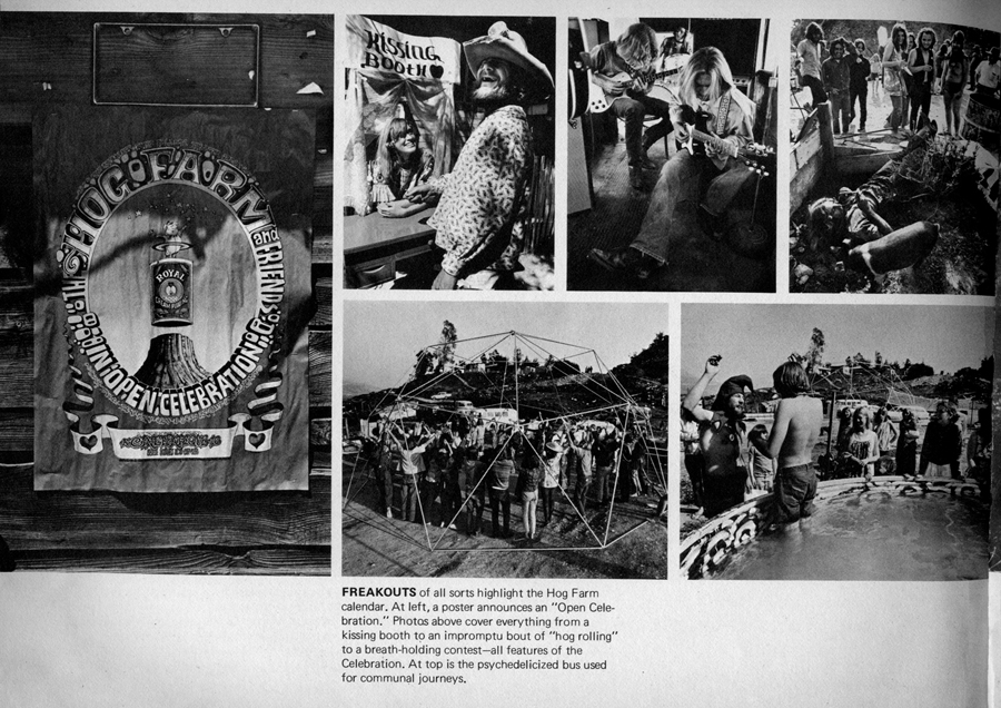 The farm, as Romney suggests, is more than a summer camp for misfits. It is a thriving spiritual community, an experiment in utopian living. You get the idea when you attend the highpoint (literally) of the Hog Farm day, just before bedtime in the cantonment’s biggest dome. Shrouded in parachute silk and brightly lighted, the dome can be seen for miles on a smogless night. You can only guess at what the citizens of Sunland-Tujunga imagine is possibly going on inside. What is going on is this: