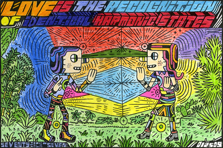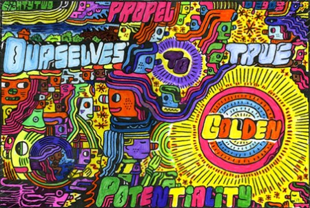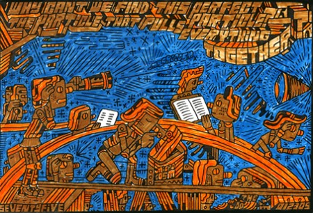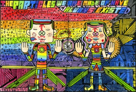 These ideas have been the main inspiration for the work I have been producing over the last few years. The project is called “The Cartoon Utopia”. I have had several gallery exhibits under this name, and have produced a large amount of comic stories related to this theme. I’ve begun to see similarities between so many schools of thought: spiritual, scientific, philosophical. My work involves trying to relate some of these themes, and to help people notice these similarities. In the comic I refer to the idea of a “Unified Theory” that governs all things, and make reference to the fact that all material in the universe erupted from one initial point during The Big Bang. This idea could be referring to science or theology. At a time in history when we are constantly bombarded with polarized opinions regarding such matters, I hope that people who come across the comic might see these connections.