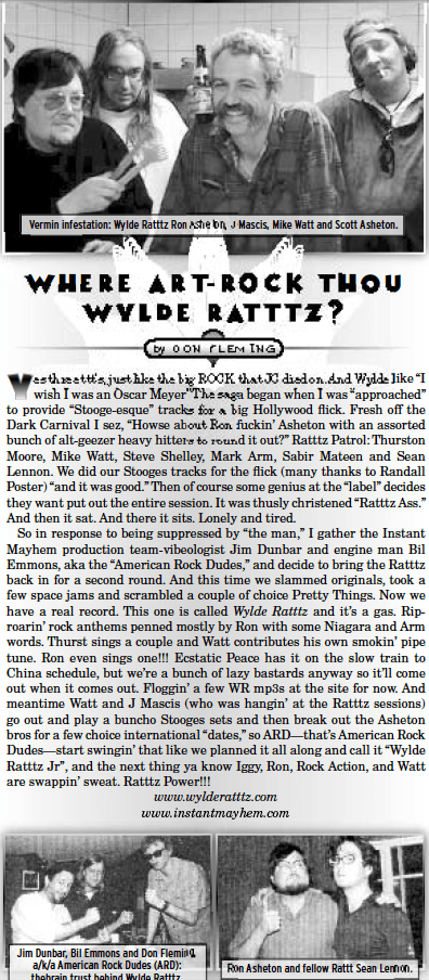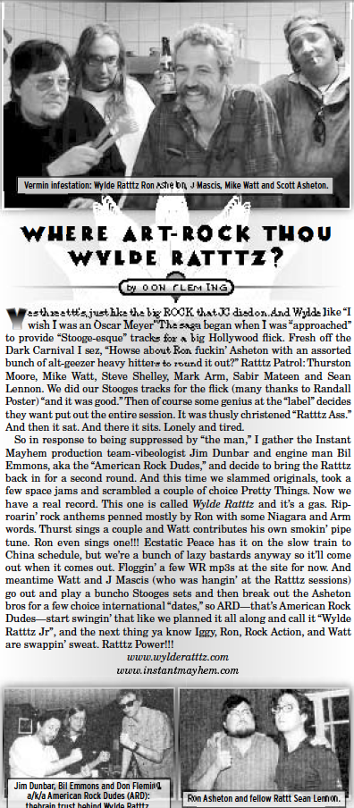 So in response to being suppressed by “the man,” I gather the Instant Mayhem production team-vibeologist Jim Dunbar and engine man Bil Emmons, aka the “American Rock Dudes,” and decide to bring the Ratttz back in for a second round. And this time we slammed originals, took a few space jams and scrambled a couple of choice Pretty Things. Now we have a real record. This one is called “Wylde Ratttz” and it’s a gas. Rip-roarin’ rock anthems penned mostly by Ron with some Niagara and Arm words. Thurst sings a couple and Watt contributes his own smokin’ pipe tune. Ron even sings one!!! Ecstatic Peace has it on the slow train to China schedule, but we’re a bunch of lazy bastards anyway so it’ll come out when it comes out. Floggin’ a few WR mp3s at the site for now. And meantime Watt and J Mascis (who was hangin’ at the Ratttz sessions) go out and play a buncho Stooges sets and then break out the Asheton bros for a few choice international “dates”, so ARD—that’s American Rock Dudes—start swingin’ that like we planned it all along and call it “Wylde Ratttz Jr”, and the next thing ya know Iggy, Ron, Rock Action, and Watt are swappin’ sweat. Ratttz Power!!