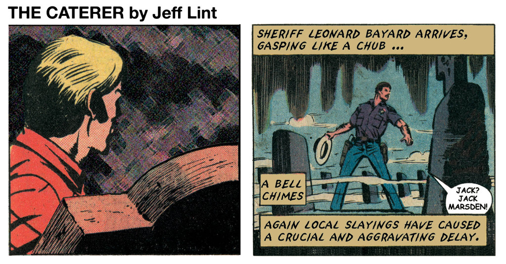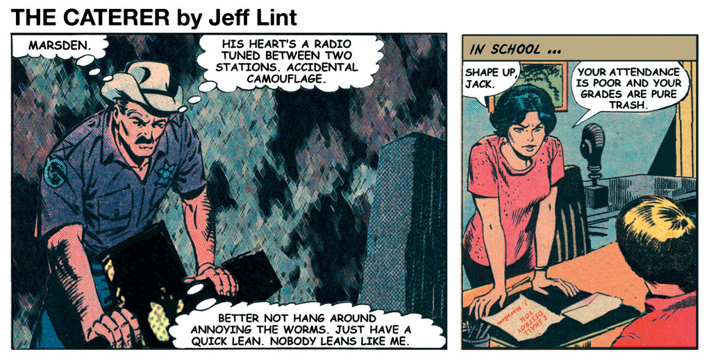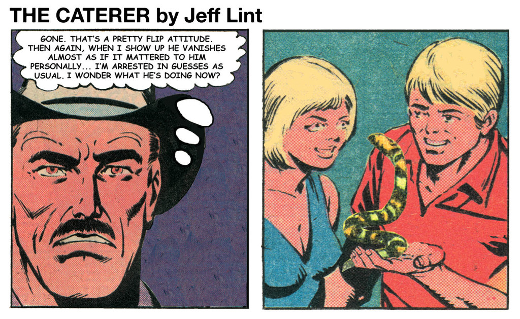 Lint’s idea of an acceptable hero was a spider with multiple eyes like rally car headlights who, when issued an order, would jet tears of mirth from the entire bank of eyes. Characters such as Felis Arkwitch and The Caterer’s Jack Marsden are fine examples of such tricksters. I wonder what he’s doing now?