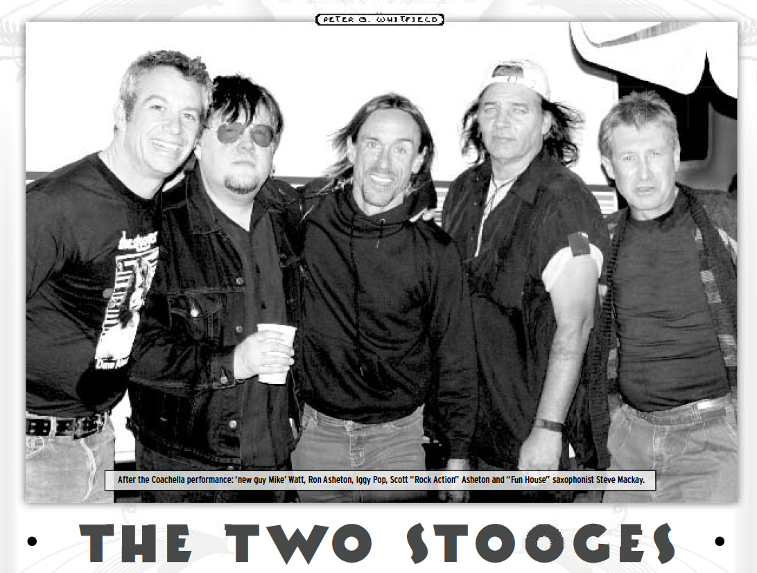 Ron’s participation in the Wylde Ratttz sessions in ‘98 [see sidebar] eventually led to an invitation by J Mascis & the Fog to play songs live dates with his band, then featuring ex-minuteman Mike Watt on bass. Watt, who had been playing the Stooges songs for years (see “From a minuteman to a Stooge”) was the singer on the Stooges songs the band performed each night for the numbers when the group wasn’t being joined by guest vocalists, which was often. These shows attracted enough heat for Sonic Youth, curators of the 2002 All Tomorrow’s Parties, to ask Asheton, Mascis and Watt to do an all-Stooges set at the UCLA festival, with secret guest vocalists.
